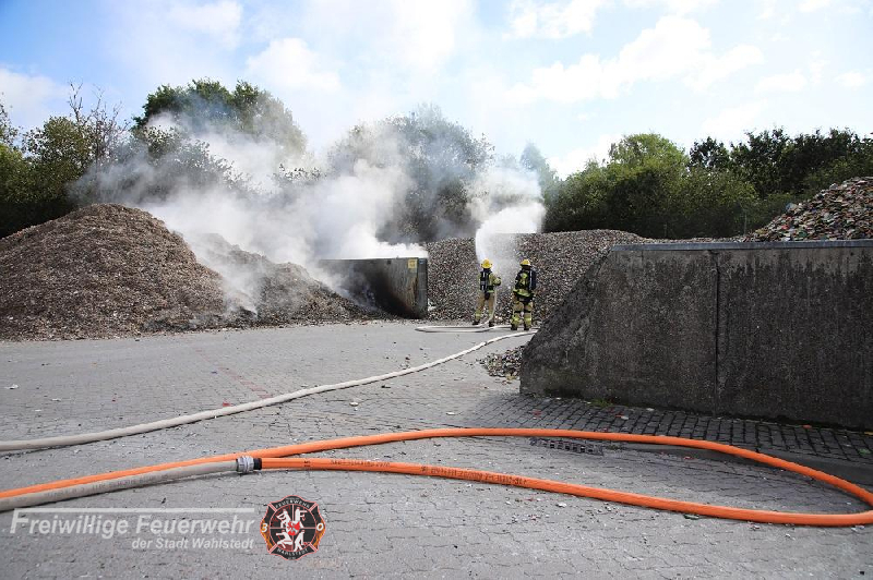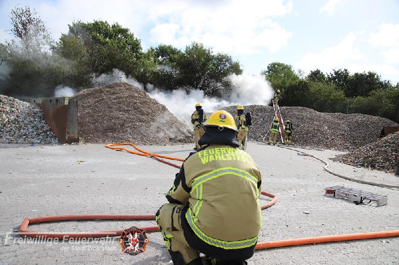 Im Rahmen dieser Erkundung stellte der Einsatzleiter eine starke Rauchentwicklung und Flammenschein auf einem Betriebsgelände in der Holsteinstraße fest. Sofort wurde die Freiwillige Feuerwehr Wahlstedt mit dem Einsatzstichwort "Feuer, größer als Standard" alarmiert.