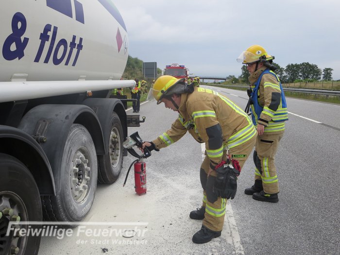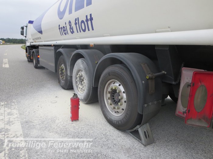 Die Bremsen des mit 33.000 Litern Diesel gefüllten Tankwagen überhitzten. Der Fahrer nahm bereits erste Löschversuche mit einem Feuerlöscher vor und verhinderte so Schlimmeres.